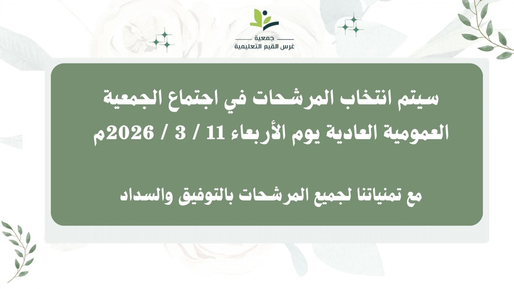 أسماء المرشحات لمجلس إدارة جمعية غرس القيم التعليمية في دورته الثانية تعلن جمعية غرس القيم التعليمية عن الانتهاء من جميع الإجراءات المتعلقة بإعداد واعتماد قائمة المرشحين للانتخابات ، حيث قام مجلس الإدارة ، تحت إشراف لجنة الانتخابات ، برفع قائمة تضم أسماء المرشحين المستوفين للشروط إلى المركز الوطني لتنمية القطاع غير الربحي ، وفق النموذج المتعمد لهذا الغرض . وقد اعتمد المركز الوطني لتنمية القطاع غير الربحي مبدئياً قائمة المرشحين بعد مراجعتها ، وفي إطار الامتثال لإجراءات الانتخابات المنصوص عليها بالمادة الثانية والثلاثين من اللائحة الاساسية للجمعية ، قررت لجنة الانتخابات التنسيق مع مجلس الإدارة عرض قائمة المرشحين المعتمدة من المركز في مقر الجمعية وعلى موقعها الإلكتروني . وتؤكد الجمعية التزامها الكامل باللوائح والأنظمة وتدعو الأعضاء إلى الاطلاع على القائمة النهائية للمرشحين والاستعداد للمشاركة الفاعلة في العملية الانتخابية بما يحقق مصلحة الجمعية وأهدافها . وتعلن اللجنة بأن الاجتماع سيعقد في يوم الأربعاء الموافق 23 / 9/ ١٤٤٧ هـ في تمام الساعة 10 مساء . أسماء المرشحات لعضوية مجلس الإدارة في دورته الثانية وهم :